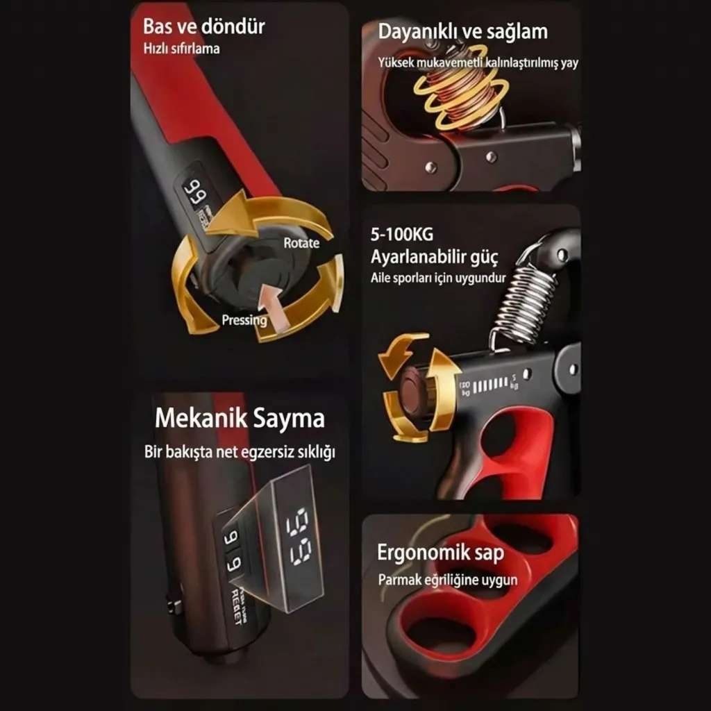 Entegre dijital sayaç, yapılan her sıkma hareketini otomatik olarak kaydeder. Manuel saymaya gerek kalmadan antrenman ilerlemenizi net şekilde takip etmenizi sağlar. •5–100 kg Ayarlanabilir Direnç