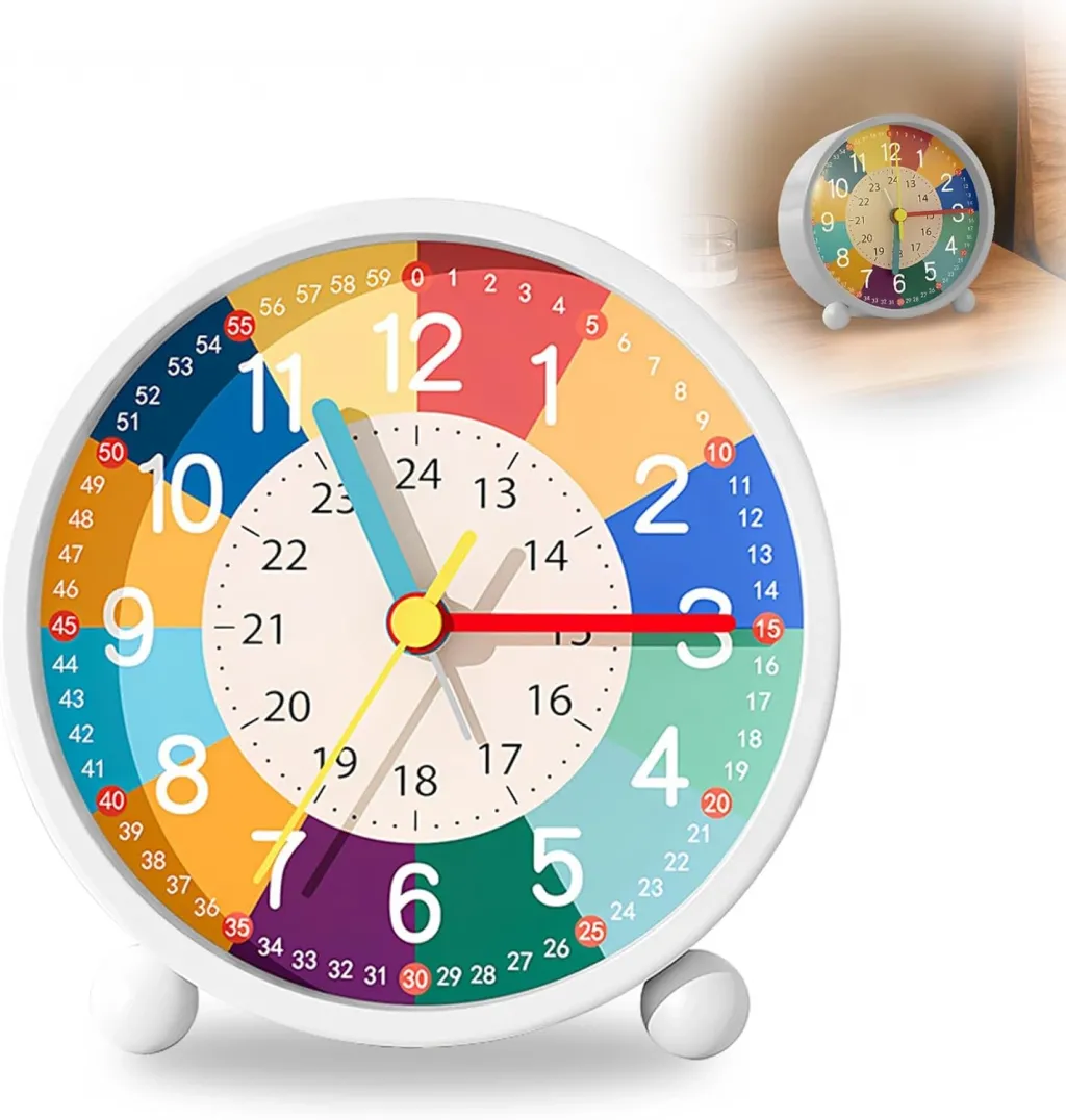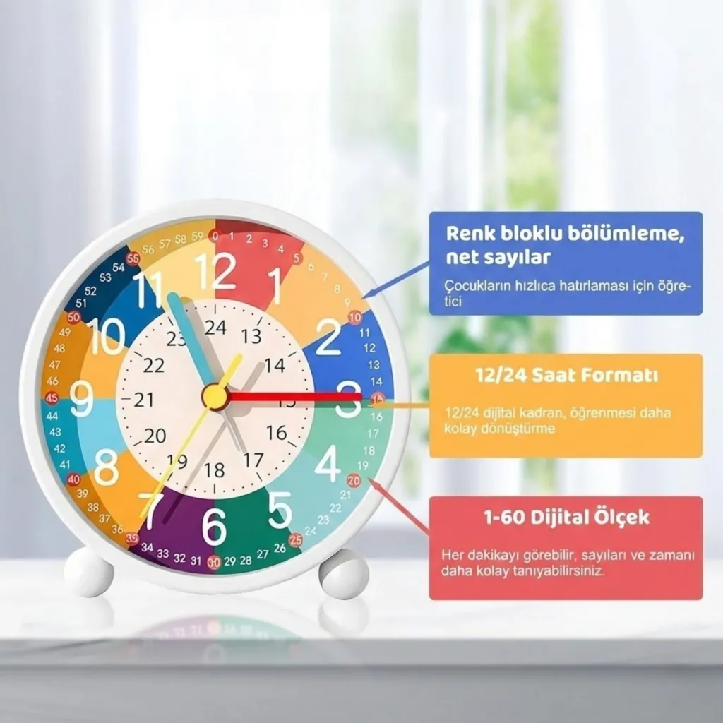 • Çocuklara Uygun Renkli Tasarım Renkli ölçekler, büyük ve net rakamlar sayesinde çocuklar saat, dakika ve çeyrek saat kavramlarını kolayca öğrenir. Zamanı okuma ve dakiklik alışkanlığı kazandırmaya yardımcı olur.