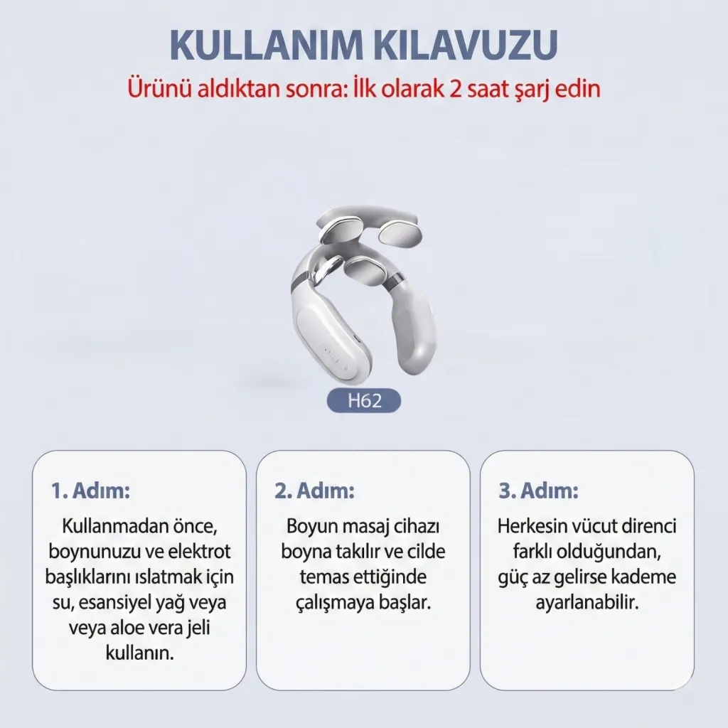 H62 akıllı masaj aleti; boyun, sırt ve omuz bölgesinde oluşan kas gerginliğini azaltmak ve derin rahatlama sağlamak için TENS (Transkutanöz Elektriksel Sinir Stimülasyonu) ve EMS (Elektriksel Kas Stimülasyonu) teknolojilerini bir arada kullanır. Günlük kullanım için güvenli olan 5V düşük voltaj ile çalışır.