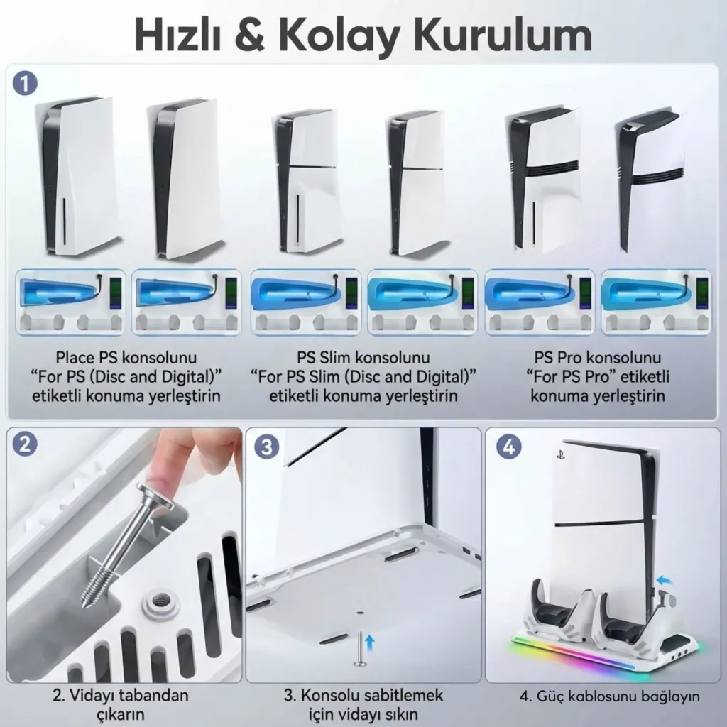 PlayStation 5 konsolunuz için özel olarak tasarlanmış bu çok fonksiyonlu dikey stand; soğutma, şarj ve düzeni tek üründe bir araya getirir. Güçlü fan sistemi, RGB aydınlatması ve kompakt yapısıyla oyun performansınızı desteklerken setup’ınıza şık bir görünüm kazandırır.